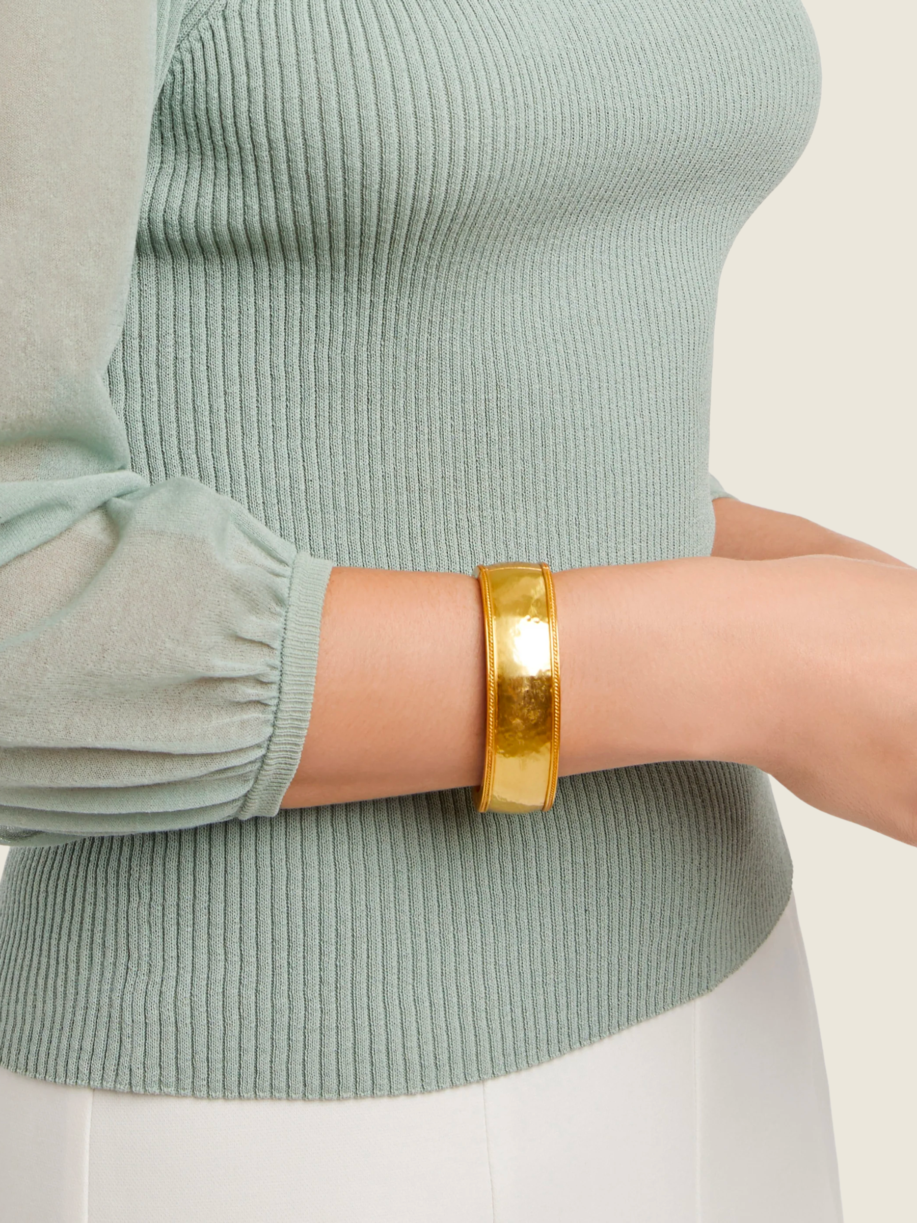 Luxuriously gilded wide bangle with fine twisted wire detail.