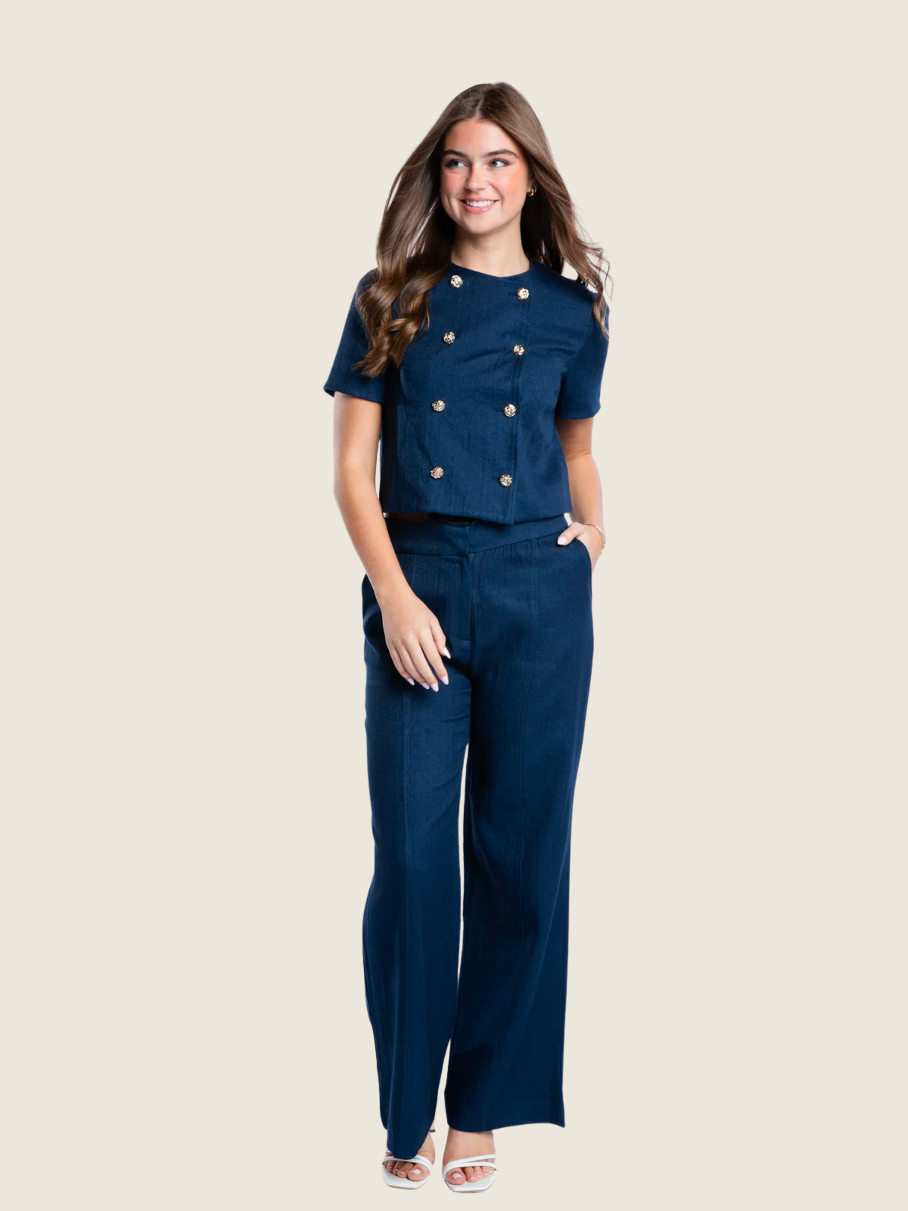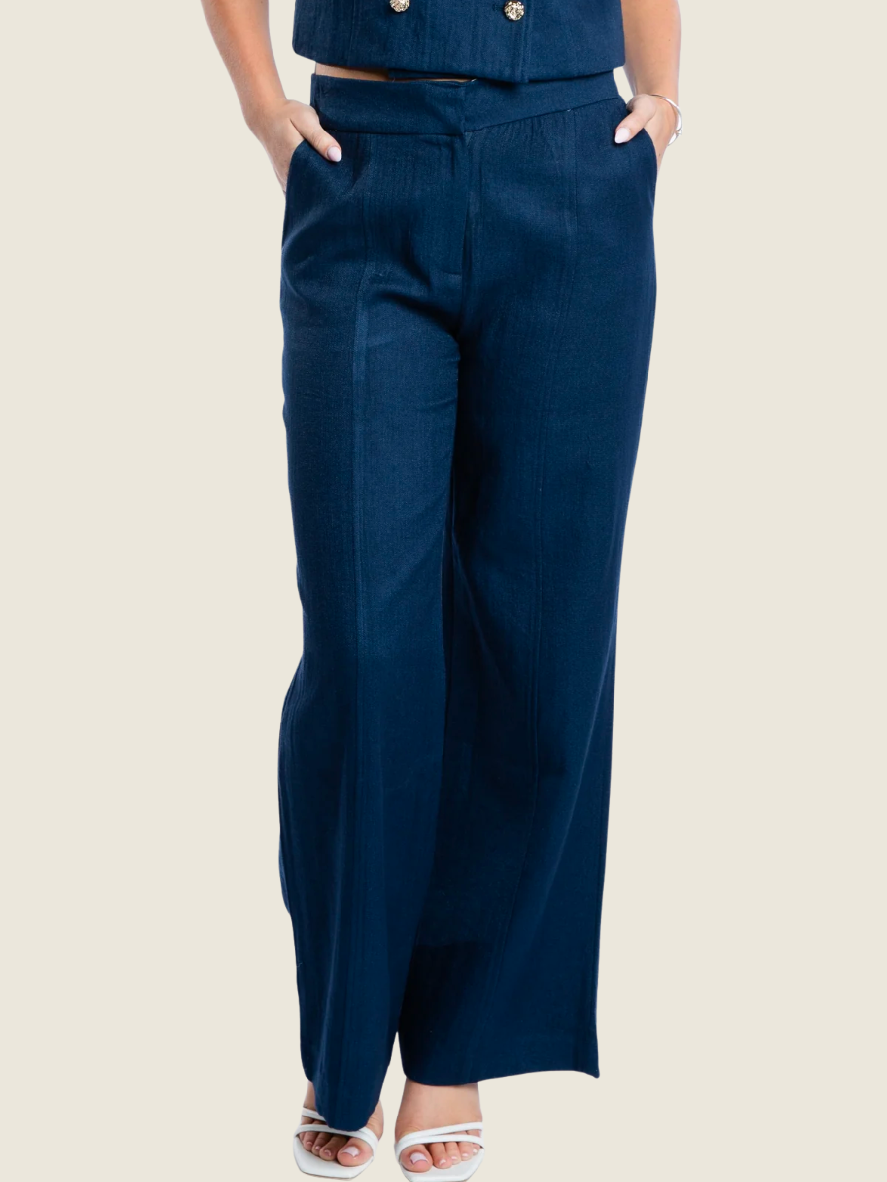 The Nelly pant is designed for effortless polish with all-day comfort. Featuring an easy fit, wide waistband, and two functional pockets, this flattering silhouette sits beautifully on the waist while offering a relaxed, tailored drape through the leg. Styled with the Molly short-sleeved jacket, it creates a chic, modern suit that feels as good as it looks - perfect for workdays that turn into evenings out.