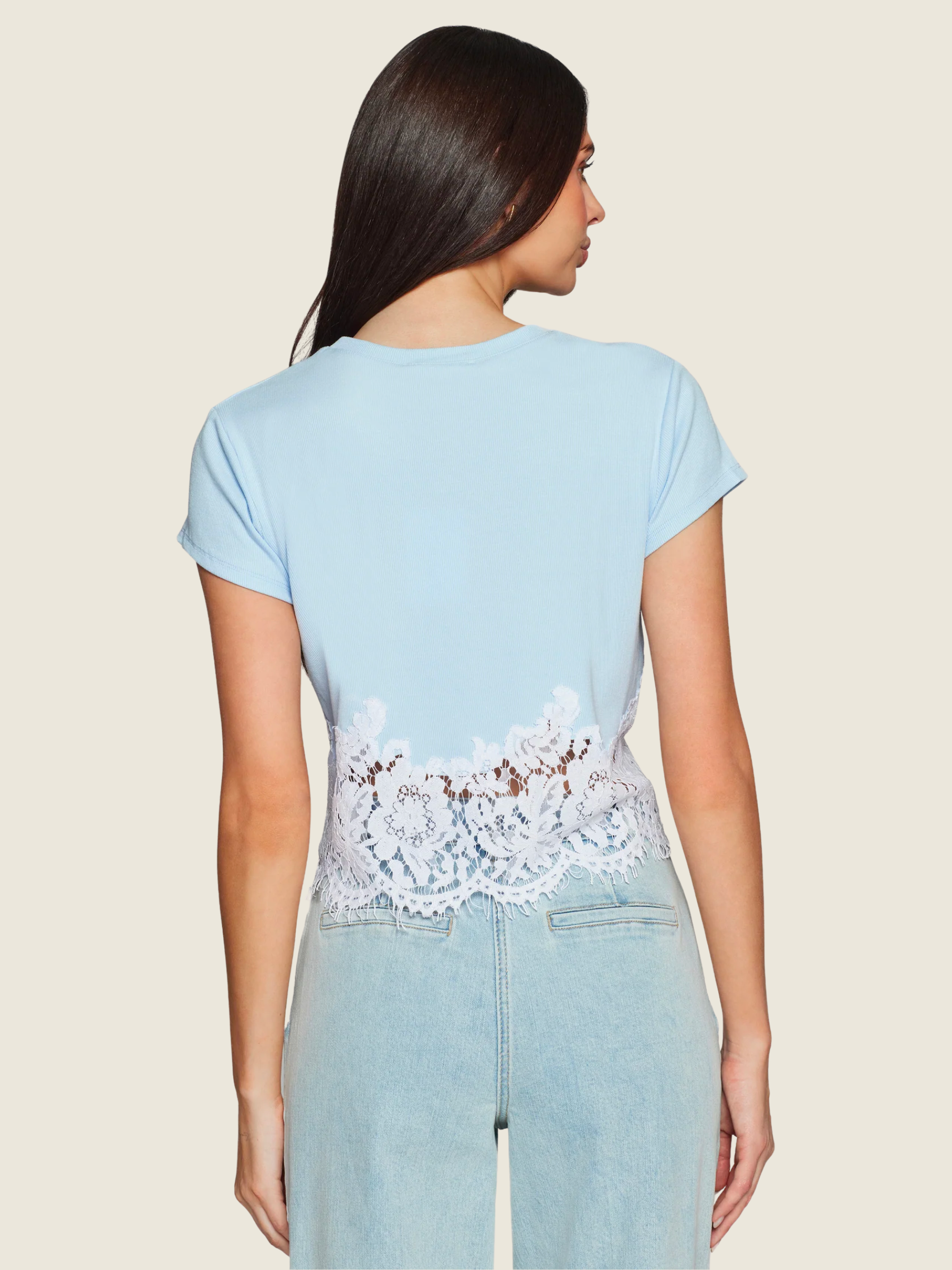 Meet the Paige Rib Lace Combo Top, a feminine knit finished with an intricate lace panel for a romantic twist. Soft, stretchy, and effortlessly polished, it dresses up denim or elevates tailored looks with ease.