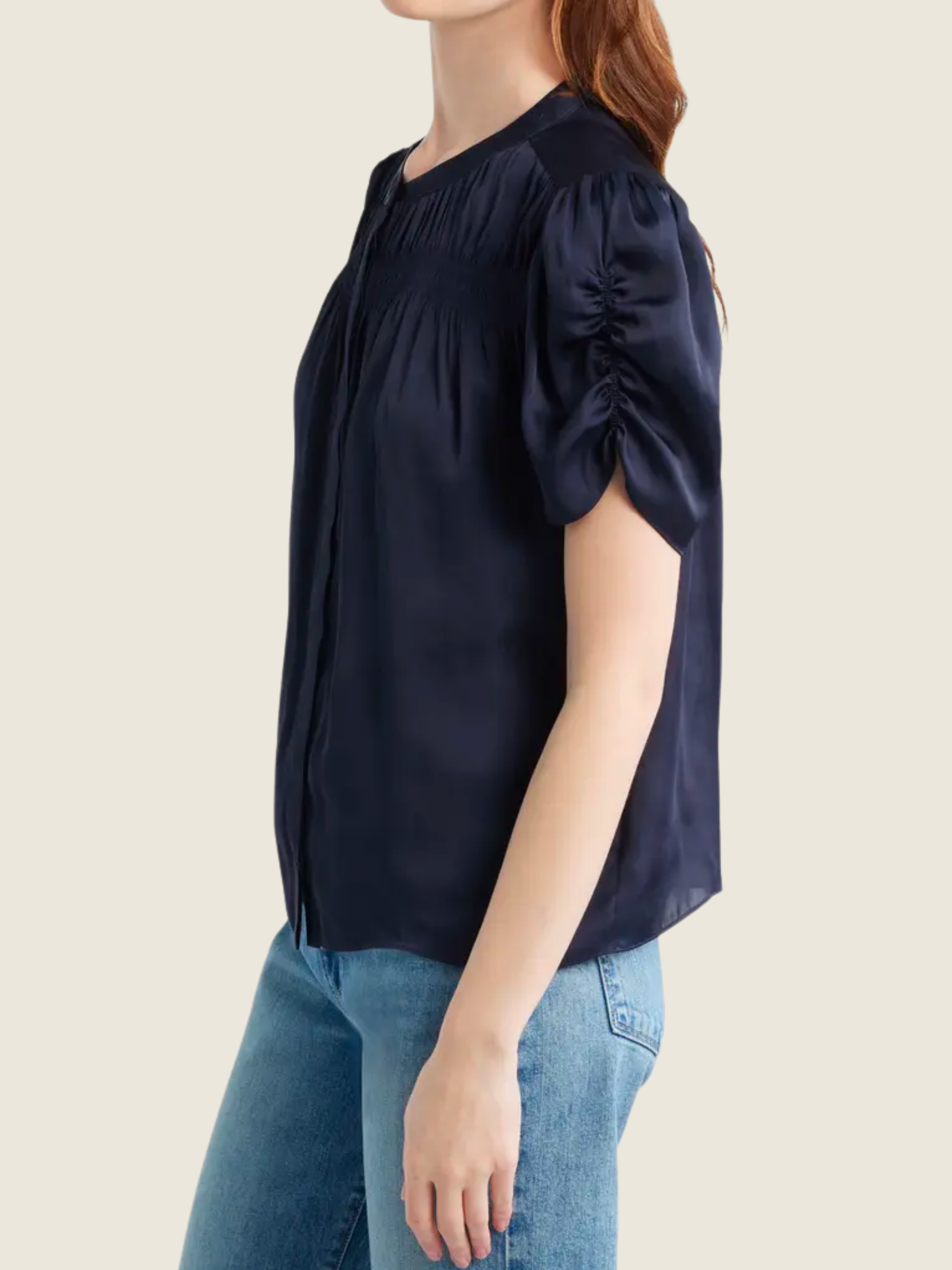 This polished button-up is ready to take on the day with silky satin and a rich solid hue.